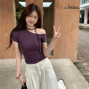 2026 Y2K Summer T Shirt Women Kpop Sexy Off Shoulder Short Sleeved Shirt Tee Shirt Halter Slim Tie Crop Top T-shirt Woman Cloth