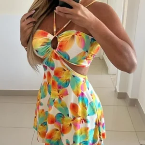 Beach Dresses for Women Summer Floral Print Halter Sleeveless A Line Mini Dresses Women's Sexy Waist Hollow Out Vacation Dress