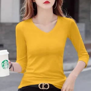 2025 New Fashion Women's V-Neck Mid-Sleeve T-Shirt Clothing Casual Autumn Winter Top Stretch Yellow Sleep Base Undershirt
