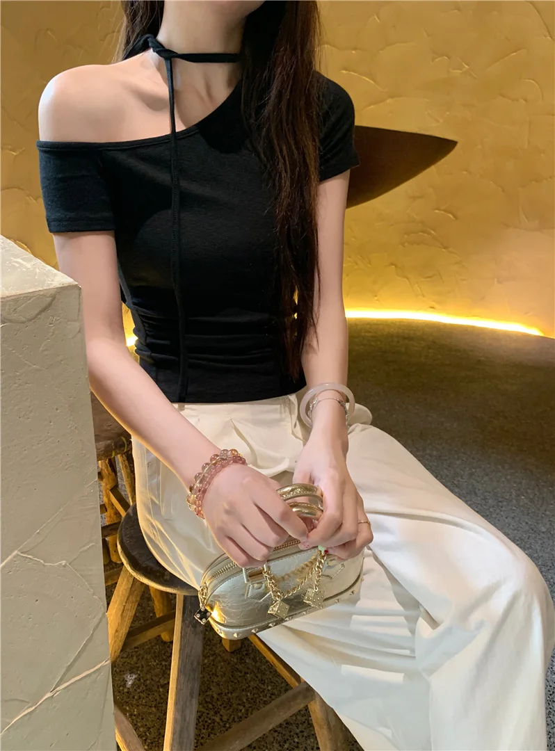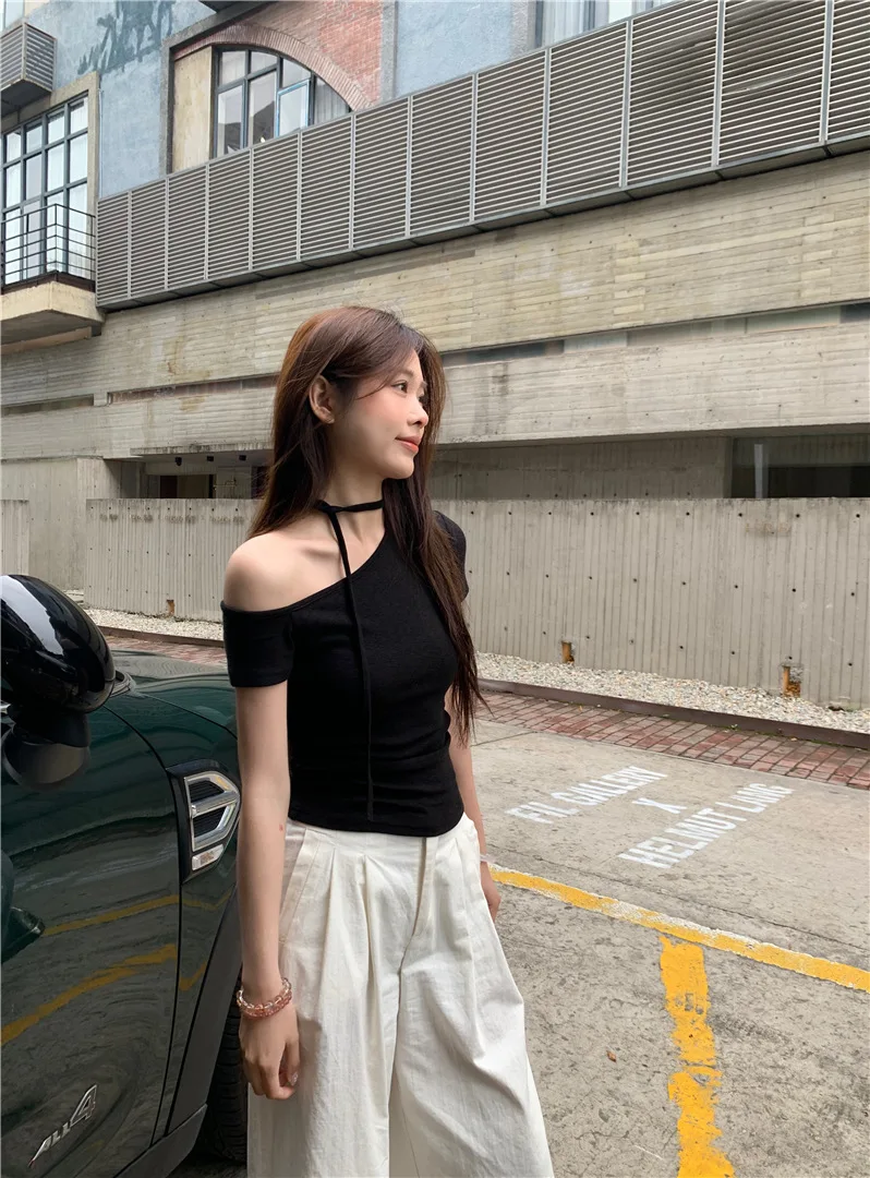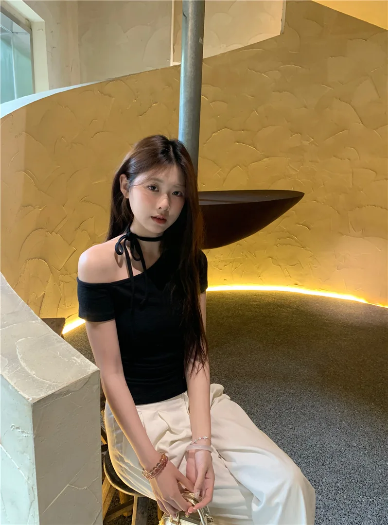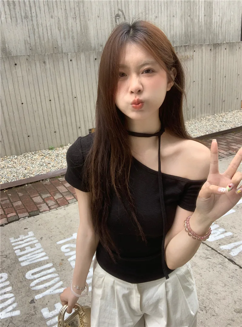 Home/Fashion/Women/Dress/2026 Y2K Summer T Shirt Women Kpop Sexy Off Shoulder Short Sleeved Shirt Tee Shirt Halter Slim Tie Crop Top T-shirt Woman Cloth