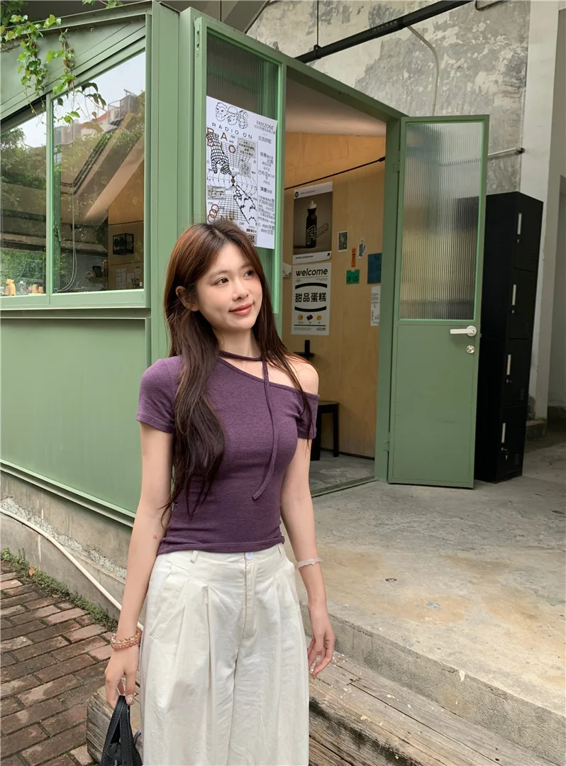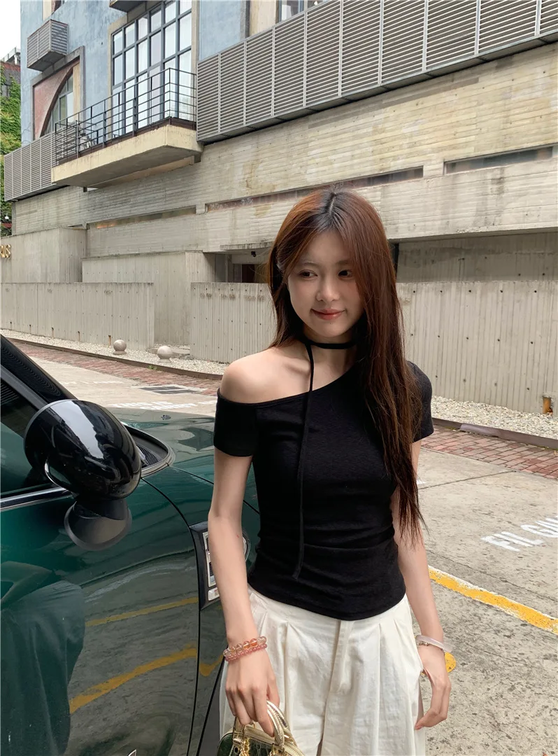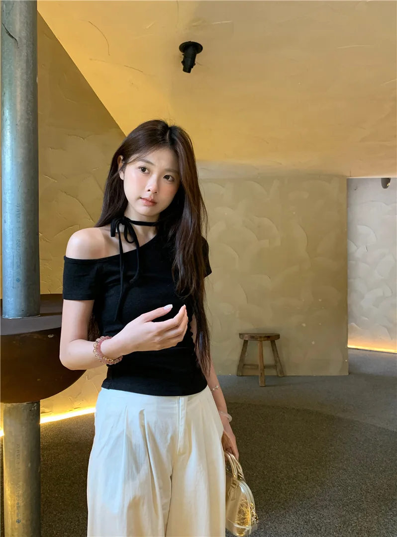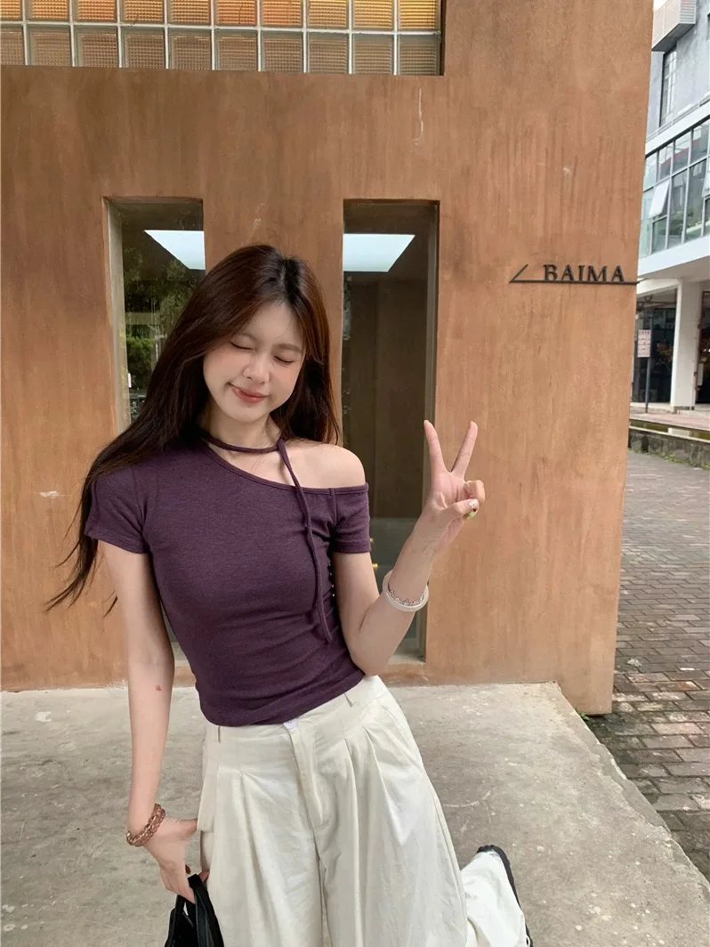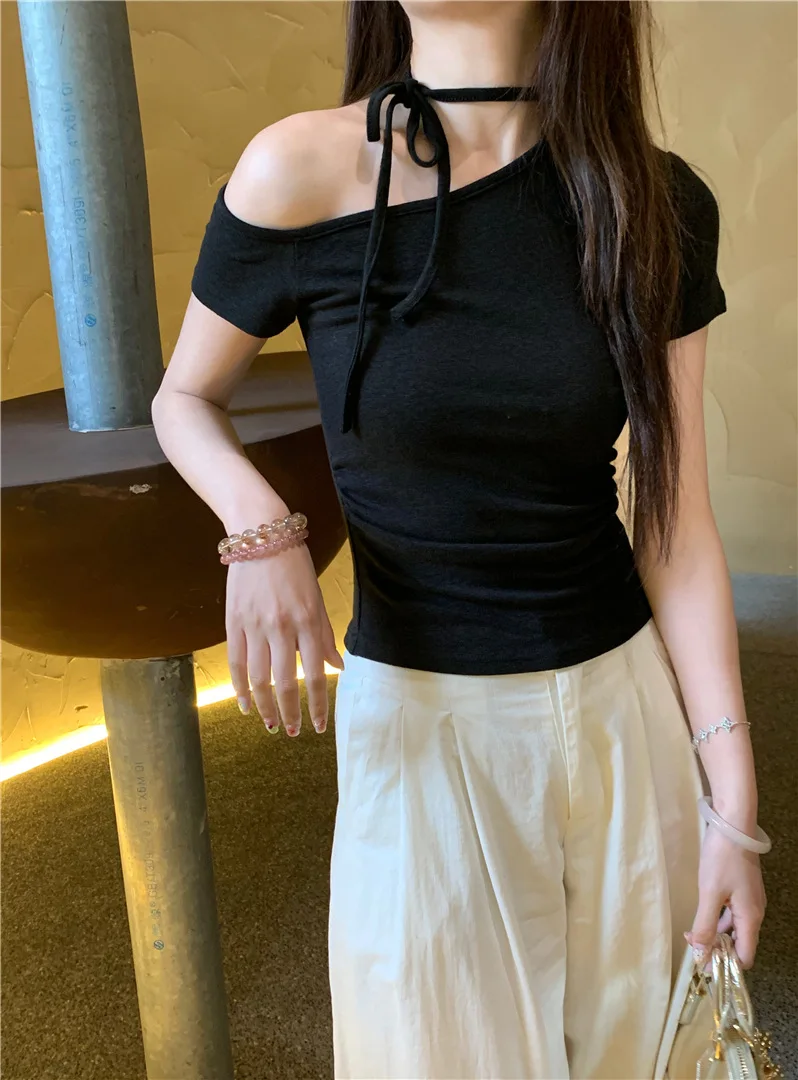 2026 Y2K Summer T Shirt Women Kpop Sexy Off Shoulder Short Sleeved Shirt Tee Shirt Halter Slim Tie Crop Top T-shirt Woman Cloth