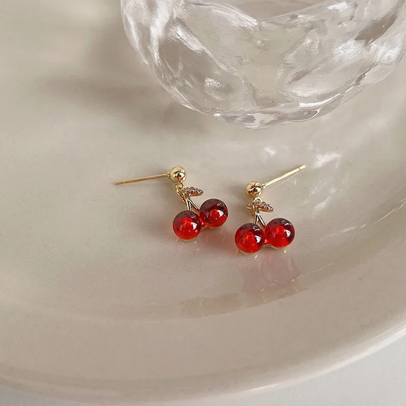 Sweet Red Cherry Pendant Necklace Dangle Stud Earrings Jewelry Set Shiny Gold Chain Jewery Set for Party Wedding Girls Gifts